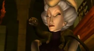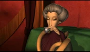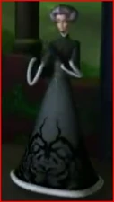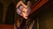 Nosi długie czarne rękawiczki, a także złoty naszyjnik z trzema czarnymi kamieniami i złoty łańcuszek z czarnym kamieniem. Na początku tej sceny ma na sobie zieloną maskę białą z fioletowymi piórami wzdłuż górnej krawędzi i kapelusz w kształcie trójkątnej miski, jest ciemnozielony, o wzorze podobnym do sukienki, w kolorze czarnym i białe futrzane wykończenia na górnej krawędzi. Ma na sobie także Otto na szyi i włosy, które odcięła Roszpunce w wieży.