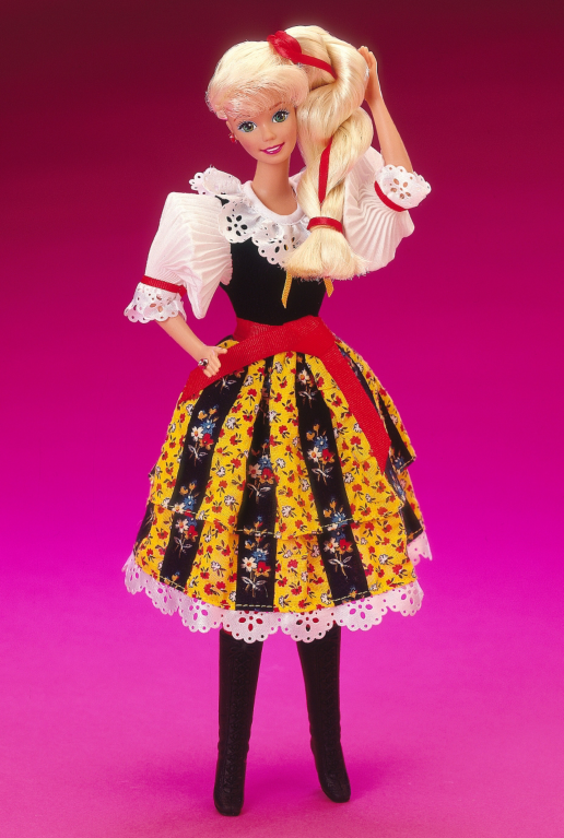 "Czechoslovakian Barbie doll is dressed for a lavish festival, wearing a traditional Slovakian costume. This brightly colored ensemble features a full flowered skirt with lacy border, a blouse with frilly collar and big sleeves, red tights, and black “lace-up” boots. Her long braided blond hair is tied with a red ribbon, and her waist, too, is cinched with a red sash." [1]