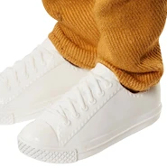 - White sneakers complete the look.