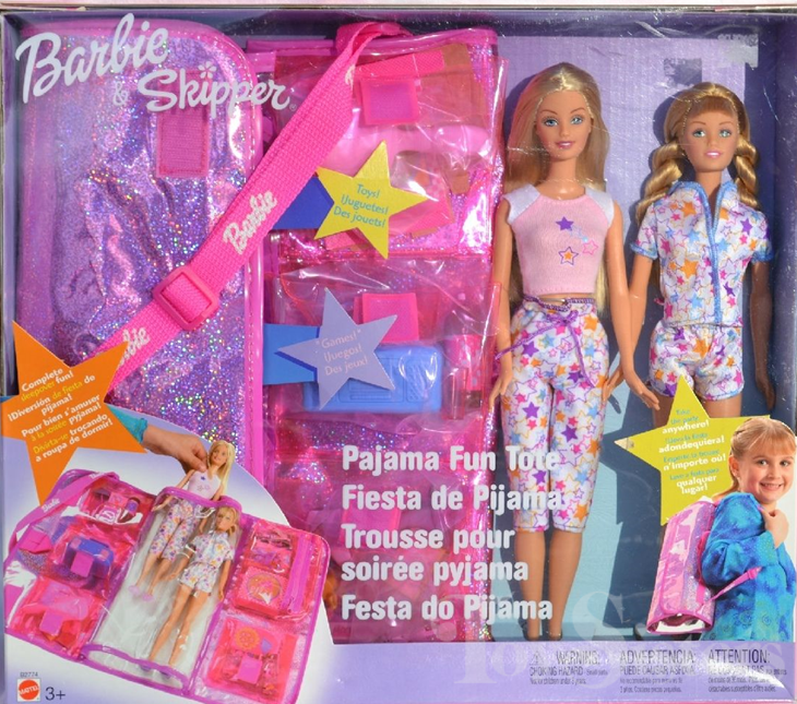 Barbie & Skipper Pajama Fun Tote is a 2003 Mattel production set. Model #B2774. Complete sleepover fun! You can take the party anywhere! Pajama Time fun with Barbie and Skipper dolls! CONTENTS: BARBIE Doll that's approx. 11.5" tall with blonde hair and blue eyes. Barbie Doll wears PJs that are a pair of white Capris w/colorful star pattern & purple bow at the waist, & Top is light pink with white at the shoulders & star pattern on front, & it also looks like she's wearing pink slippers. SKIPPER Doll is approx. 10" tall w/ darker blond hair in braids and green/gray eyes. Skipper doll wears a pair of 2 piece PJs that are white with colorful stars, & her bottoms are Shorts with matching short sleeve Top. Skipper doll appears to be wearing purple Slippers on her feet. Also included is a Sparkly Pink Tote Bag that has an adjustable fabric shoulder strap with Barbie written on it. The Tote is approx. 8-3/8" wide x approx. 12" long (measured from outside the box - size may vary) & the Tote Bag has transparent pink plastic compartments w/Velcro closures. The Tote Bag opens, but I do NOT have those sizes as the box is sealed. There appears to be a clear compartment in the center that can hold both dolls for easy take along fun! There are accessories included for more Sleepover fun! Dolls canNOT stand alone. Colors & decorations may vary from those shown on box.