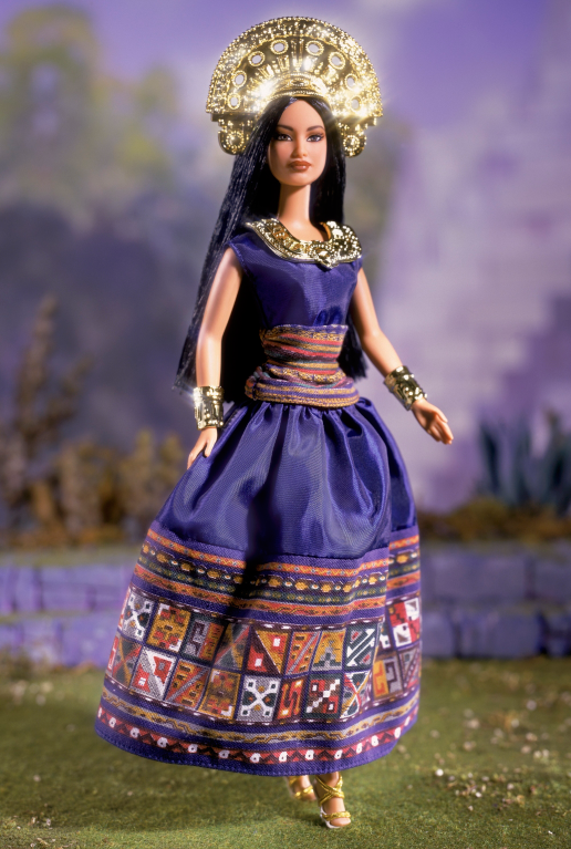 "Princess of the Incas™ is inspired by the regal dynasty of an exotic age. She wears a taffeta dress of deep blue with a colorful decorated border patterned after authentic Incan textiles. Throughout this empire, it is believed that the kings and queens are descendants of Inti, the powerful Sun god. And so, the divine princess wears many pieces of dazzling golden jewelry. Gold is the symbol of Inti and a precious metal that was owned only by royalty. Golden embellishments include arm cuffs, a necklace, and a crown." [1]