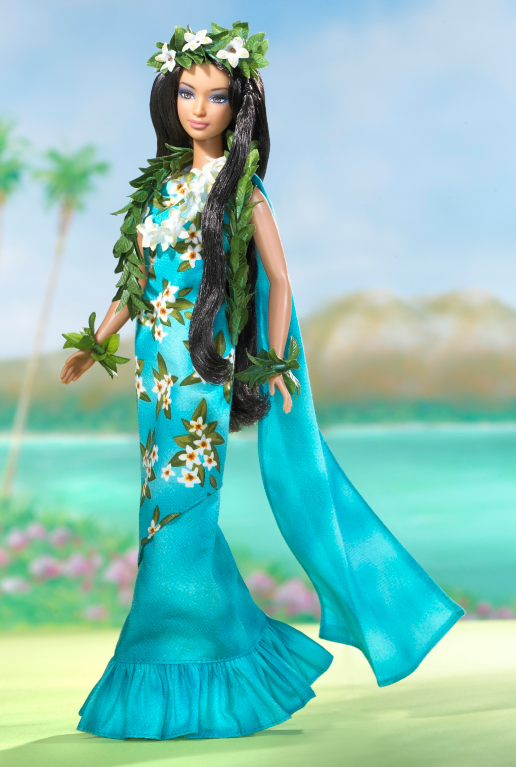 The Hawaiian people live on beautiful tropical islands in the Pacific Ocean. In this tropical paradise, a beautiful girl with long black hair walks along the shore saying “Aloha” to everyone she sees – this greeting means both hello and good bye. Her father is the chief of the people. The princess loves surfing known as He’e nalu or wave-sliding in old Hawaiian. The Princess of the Pacific Islands™ wears a traditional island dress known as a muu muu and a lei of "plumeria", a fragrant blossom native to the islands." [1]
